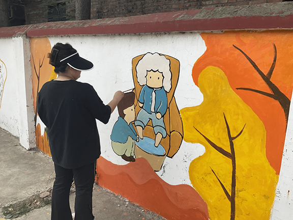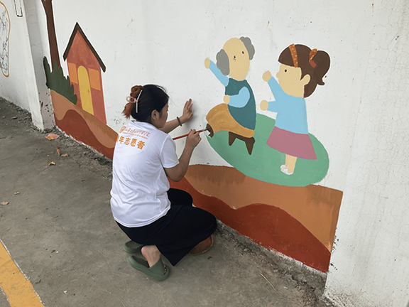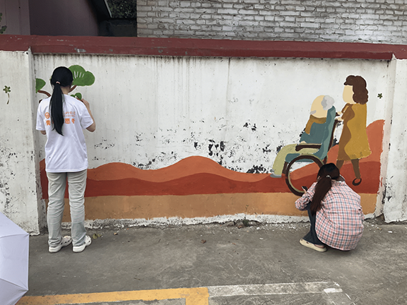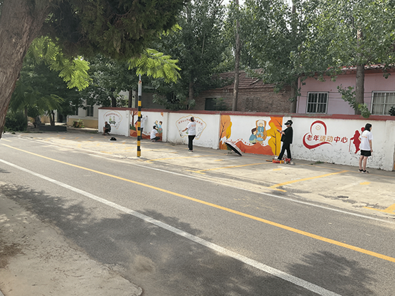 实践第二天,为了给老人家们营造一个更加温馨的环境,志愿者们搜集了大量敬老爱老为主题的绘画素材,提前准备好颜料、画材。经过共同的努力,最终完成了一幅幅有创意、有意义的手绘墙,将中华民族的传统美德与现代艺术有机地结合在一起,进一步弘扬尊老敬贤的传统美德与传承民族文化。