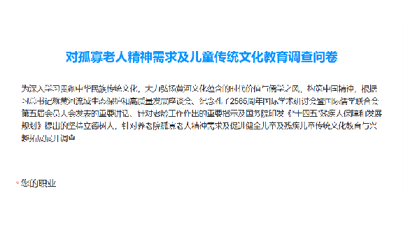 实践活动开始前,实践团成员们查阅并了解了曲阜市文化底蕴,对当地孤寡老人、儿童(包含残障儿童)情况以调查问卷形式展开调研,问卷内容主要针对孤寡老人精神需求及促进儿童(包括残障儿童)思想文化教育进行设置。