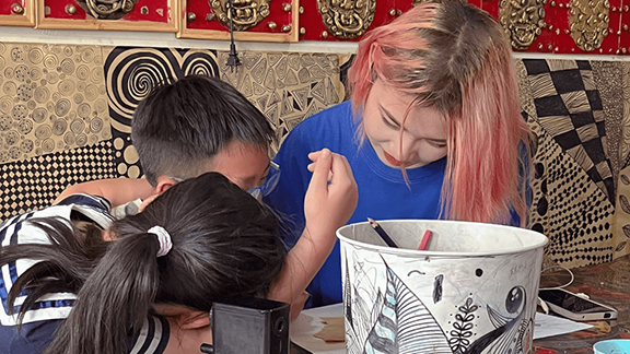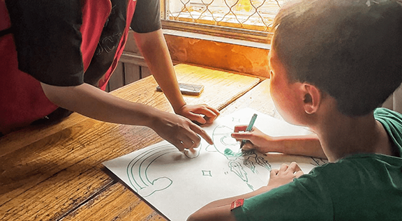 7月12日,实践团前往当地一家美术工作室,结合实践历程与个人专业,成员们向画室的孩子们讲解黄河的重要性,普及保护黄河流域生态知识,阐释儒家思想,教导如何以其中的思想去帮助他人。随后,成员们为孩子们讲述五四运动、长征、百团大战、抗美援朝、两弹一星等党史故事,呼吁孩子们爱国爱党、关爱孤寡老人与病残儿童,孩子们纷纷表示受益匪浅。随后,实践团成员和孩子们共同绘制国旗、“几字形”黄河图、艺术字体“儒”以及能够表达孩子们热爱国家、对未来充满期待的图案。