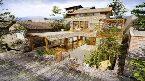 根据调研结果,实践队聚焦乡村民宿进行改造与设计。建筑外观采用传统的乡村建筑风格,如农舍、木屋或仿古建筑等,以融入自然环境,并展现乡村的朴素和自然之美。建筑的外墙采用自然色调的涂料或木质装饰,以增加与周围环境的和谐感。乡土材料易于获取,不会对环境造成过大的破坏,可以减少对其他地区材料的依赖,降低能源消耗和碳排放,促进可持续发展和环境保护。客房设计简洁而温馨,以提供舒适的居住环境。