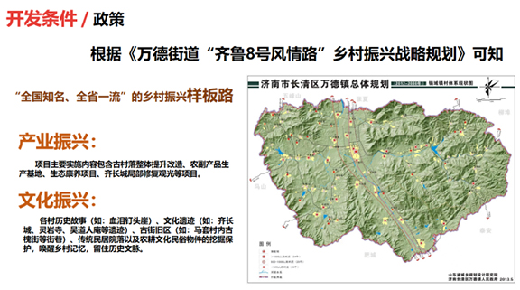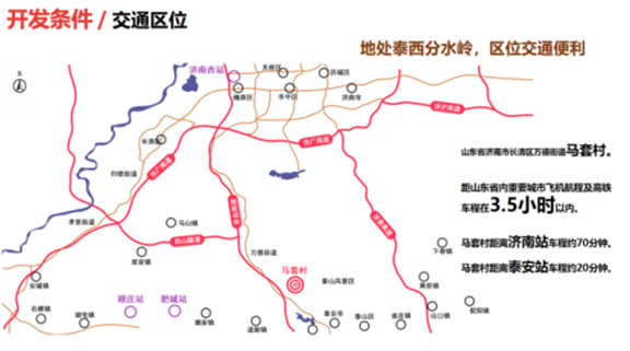 马套村辖地面积6.7平方公里,耕地面积1336亩,山场面积7000多亩。通过调查研究发现,该村落具备丰富的自然资源与人文资源。茶产业是马套村最早发展起来的龙头产业,茶叶核心种植区达700亩,长清灵岩寺是中国茶道、茶文化的祖庭。自唐朝起济南长清已经开始茶叶的种植。马套村因地处长清,又临近古人上泰山封禅、上香的必经之路,亦深受茶文化影响。马套村位临泰山脚下,紧邻泰山景区北侧入口处的泰山桃花峪景区,车行10分钟内可达。村庄与坐落在万德街道的 “灵岩寺”景区相距15公里,车行30分钟。灵岩寺始建于东晋,距今己有1600多年的历史,自唐代起就与浙江国清寺、南京栖霞寺、湖北玉泉寺并称“海内四大名刹”并名列其首。灵岩寺现为世界自然与文化遗产泰山的重要组成部分,是全国重点文物保护单位,国家AAAA级风景名胜区。村域内有始建于春秋时期的齐长城,包含齐长城的至险点“钉头崖”,迄今已有2600多年的历史。马套村村域内有马套将军山景区,是国家AAA级旅游景区。