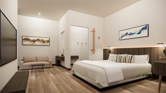 在民宿周围设置茶室,供客人品茶和体验茶道。茶室的设计遵循传统的茶室布局和装饰,如竹制的茶具、茶道具和茶具展示架等,以展示茶道的仪式感和美学。在民宿的外墙或室内空间中加入茶文化的艺术装饰,如茶叶的图案、茶道的插画或茶具的摆设等,以增加茶文化的氛围和美感。