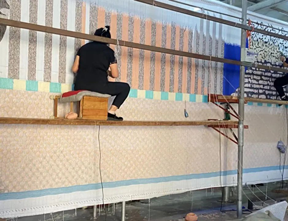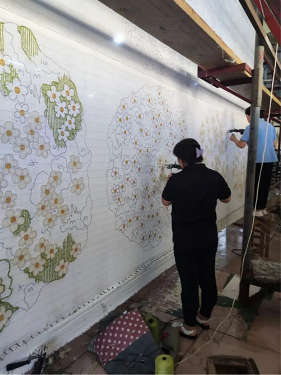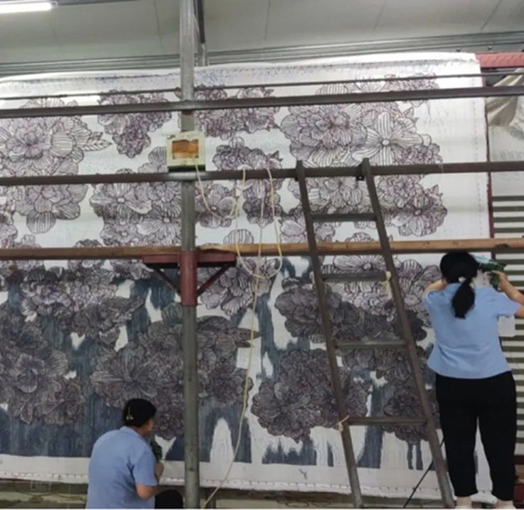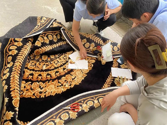 瑞鑫集团专注手工枪刺胶背地毯35年,以传统的中国京式、彩花、古典、京彩、美术式为主,充分吸收国内外艺术精华,将每一张地毯制作成艺术精品。实践团队在现代手工艺术学院副教授王斌的带领下实地调研考察簇绒地毯,按照簇绒地毯的历史发展、材料、纹样、工艺等多个方面进行了深入的调研,同时也对传统手工文化进行进一步的探寻。