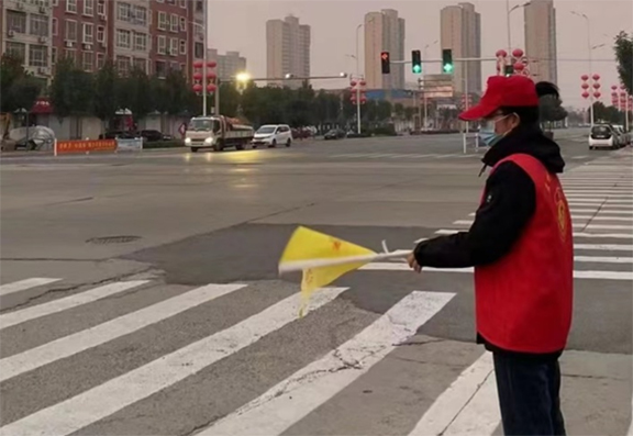 (图为热心志愿服务队成员引导机动车礼让行人)