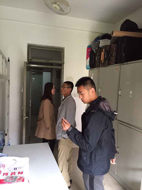 进入公寓后孙老师和张老师认真负责的检查每个宿舍的每个角落,查看有无违章电器、电线插排、饲养宠物等宿舍违规行为,对卫生不达标的宿舍进行教育与整改。经过检查,大多数宿舍能够做到开窗通风、被褥整齐、地面整洁、合理用电等,体现了大学生应有的素质,但还有个别宿舍未达到卫生标准,存在杂物堆积现象。孙老师与张老师对其进行教育并立即进行整改,达到规定卫生标准,并要求同学们以舍为家,共同维持好公寓的环境卫生。