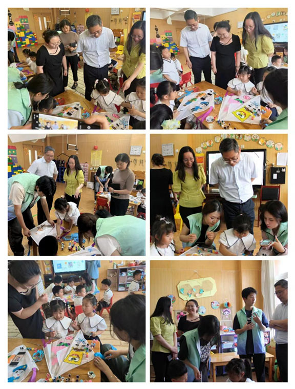 (图:两校领导老师现场观看小朋友们制作风筝)