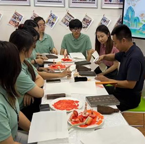 随后,团队一行来到滕州市青年之家亲身体验非遗拓印。一页页宣纸从拓板上揭下,仿佛是揭开了非遗拓印的历史面纱;一道道朱砂墨刷上宣纸,更像是青年学子谱写非遗传承浓墨重彩的一笔。每一张拓片的制作成功都饱含了老师同学们对于中华传统文化的热爱和对滕州善国匠心的尊崇。