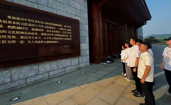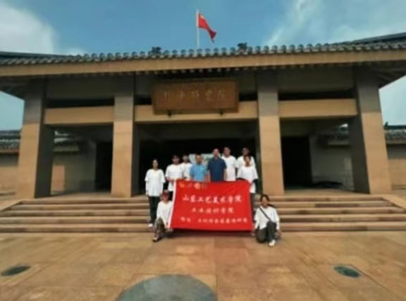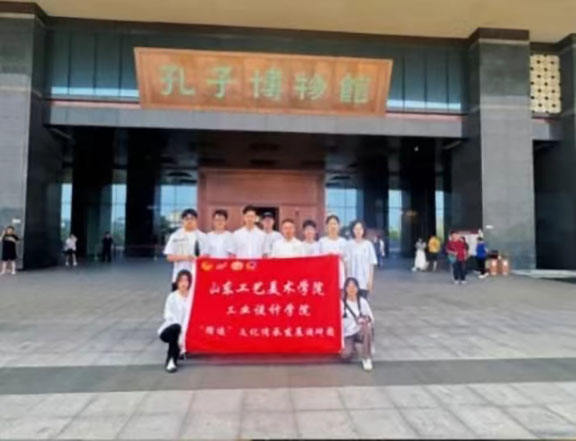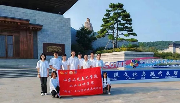下午,调研团前往中国先哲孔子的诞生地——尼山,在儒家思想智慧与现代建筑艺术结合的大学堂内感受不同的文化主题,同时,一堂“行走的思政课”在此展开。穿过悬挂着“弘扬优秀传统文化,共建人类现代文明”第十届尼山世界文明论坛标语杆旗的街道,团队成员来到尼山讲堂前,重温习近平总书记的重要讲话精神,现场开展了“赓续中华文脉,为文化‘两创’贡献青春力量”的主题团日活动。指导教师巩正、周元超结合此次调研主题,带领成员们深入学习习近平总书记的重要讲话精神,深刻领悟“第二个结合”的重大意义,明确文化“两创”中“创”的统一性、“造”与“新”的差异性,掌握以“创造性”为前提、“转化”为目的,以“创新性”为动力、“发展”为主题的“两创”哲学内涵,希望成员们在设计实践中创造出更多服务于时代、服务于民生的文化作品。团队成员们纷纷表示将进一步秉承“为人民而设计”的理念,发挥设计专业优势,弘扬和传承中华优秀传统文化,为推动文化“两创”贡献出时代青年的青春力量。
