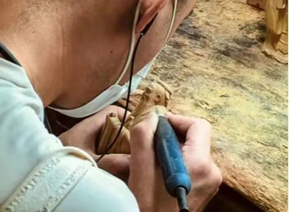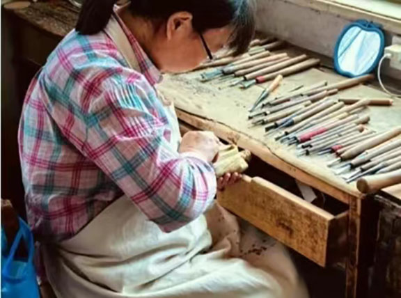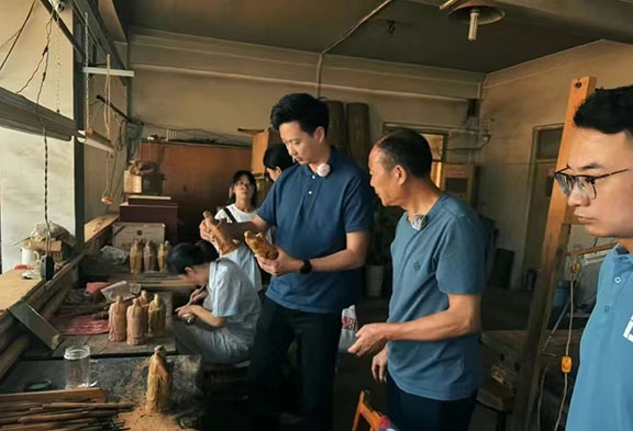15日上午,调研团走访曲阜儒源工艺美术有限公司(原曲阜工艺美术厂),调研国家级非物质文化遗产代表性传统美术项目木雕(曲阜楷木雕刻)传承发展和产业转化情况,并与国家级传承人颜景新徒弟、现公司负责人孔宪武开展访谈。楷雕是曲阜市的一种传统雕刻艺术,至今已有两千多年的历史,以当地独有的珍稀植物楷树为原料进行雕刻,在长期实践中形成了独特的艺术面貌。孔宪武详细介绍了楷雕的起源、发展、技艺与发展现状,生动描述了在孔子故里而流传的“师脉相承”理念,他表示,传统手工艺的传承与发展靠的就是一代代匠人师傅言传身教、躬身力行,才确保这一非遗技艺得以延续,这也是孔子精神的现实映照。随后,团队采访组结合访谈提纲,向孔宪武进行了专项采访,面对当前楷雕的发展困境问题时,他遗憾的表示,缺少青年力量的接续,是目前传承发展最大的问题,说不定哪一天,这一项技艺就失传了。随后,孔宪武带领团队成员参观生产车间。在看到原木变为一件件工艺品时,团队成员不禁感到新奇和惊讶,也相应激发了他们提问和体验的兴趣,深深被楷雕技艺所吸引。