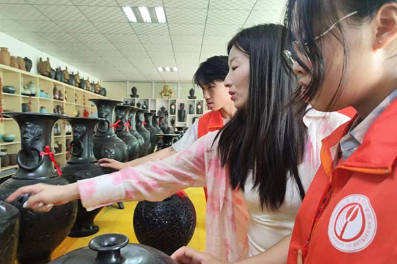 实践团队一行来到垦利区佛头黑陶研究所文化产业基地,佛头黑陶是东营市独具特色的文化产品,以其“色如墨、声如钟、薄如纸、亮如镜、硬如瓷”的特点而著称,掂之飘忽若无,敲击铮铮有声,被誉为“齐鲁黑陶之花”。成员们在基地上手体验黑陶制作,并观摩了师傅们制作的黑陶成品。