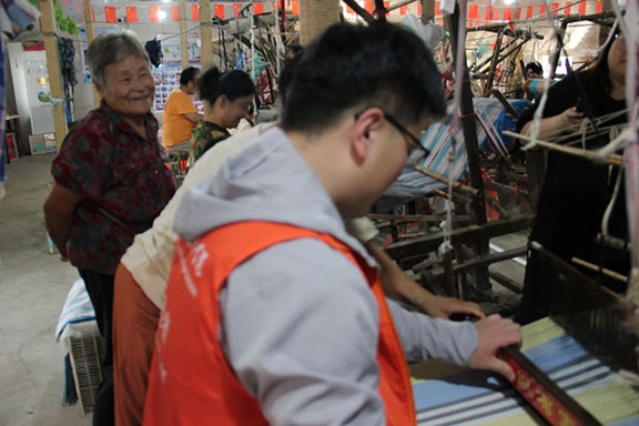 古窑十八梭,用手工诠释璞琢之美,以纯手工制作为特点,其成品精致平整,无针眼,拥有色线交织形成的丰富几何图形。“十八梭”即平布、凉席、斜纹等十八种技法,以十八种技法、七种主色为纲演变出成百上千种图案,织出风格各异的布匹,既有粗犷豪放,也有质朴典雅。团队成员在参观学习的过程中,亲身体验了纺线与织布两道工序,看似简单的操作最考验工人的精力与专注力,每一块布料都凝聚着匠人的心血。