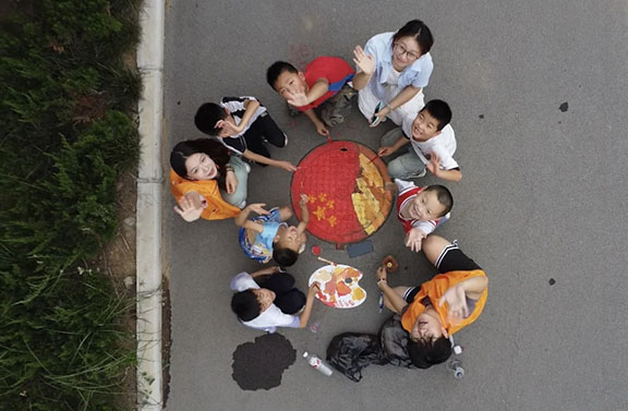 志愿者和孩子们一起绘画井盖