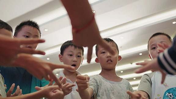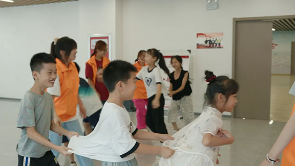 志愿者和孩子们一起做游戏