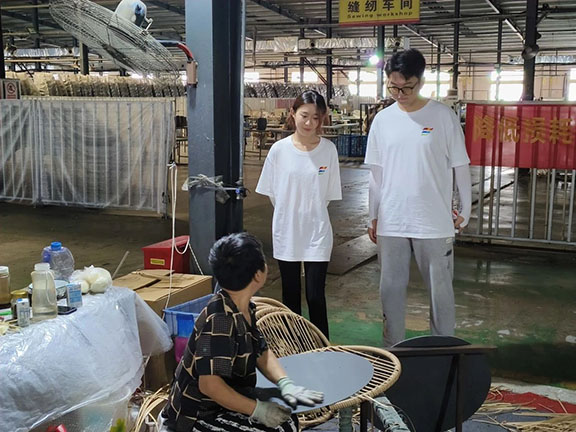16日上午,调研团前往曹县慕斯特工艺品有限公司,调研国家级非物质文化遗产传统美术项目曹县柳编的创新转化情况。顺时代之变,赢发展之机。为顺应时代潮流、满足国际化家具不同风格的市场需求,企业对柳编材料进行创新,采用新型环保可回收塑料材质进行制作加工,增强了其环保型、柔韧性、舒适性、耐用性等方面优势。在任锦鹏的带领下,成员们前往家具产品展示体验区以及生产车间进行参观。展示体验区中,可以看到风格多样的家具产品,其中以柳编家具为主,成员们在任锦鹏的讲解介绍下,用手触摸、用心感受柳编家具所带来的不同之处。同时,家具制作以人工为主,不仅带动了当地村民就业,也将传统藤编进行创新转化升级,并与欧美国家简约风相结合,进一步扩大了对外贸易,推动助力乡村振兴,实现产业高质量发展。