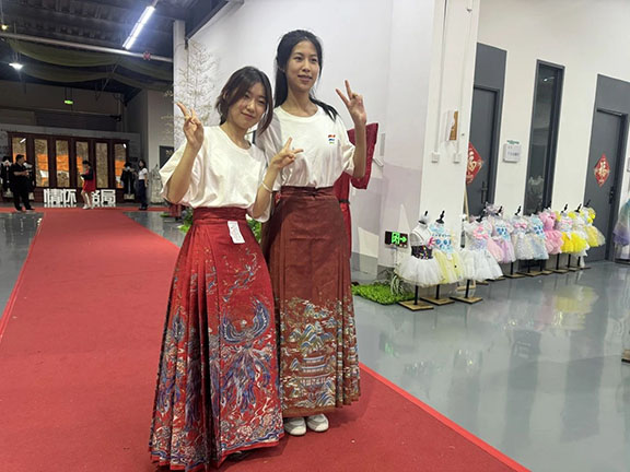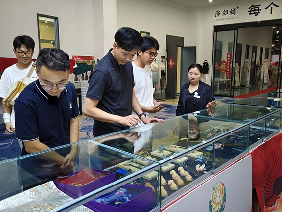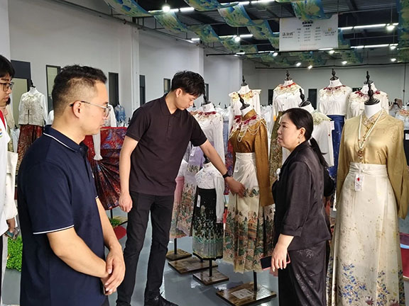 16日下午,调研团探访有爱汉服总部基地,实地考察传统服饰拉动网红经济引领“国潮风”的曹县密码。从“宇宙中心”到“产业中心”,有爱汉服是全国唯一一家集设计、生产、制作、包装、销售的一体化企业,并且采取线下源头批发、线上直播带货的形式,推动汉服产业在曹县呈现井喷式发展。“火”是有道理的。调研走访时,成员们发现这里和其他非遗企业的不同——年轻人众多。所有汉服均由年轻团队设计,融合传统文化配饰的汉服定板生产后,由年轻人直播推广,火速在年轻群体中“出圈”,呈现出件件爆款、供不应求的局面。团队成员赵福源、秦绪瑞试穿马面裙后说:“如果每天都能试穿新款式的汉服,我也想留在这工作。”不仅如此,“共同富裕”是进入企业首先看到的标语。开展“千村万人免费电商培训活动”“青年电商培训班”等培训活动1000余场次,培训青年6万余人次,提供优质岗位204个,有爱汉服擦亮“青”字号服务品牌,积极带领广大青年跑上电商经济“加速度”,在共同富裕中焕发出文化“两创”“年轻态”。