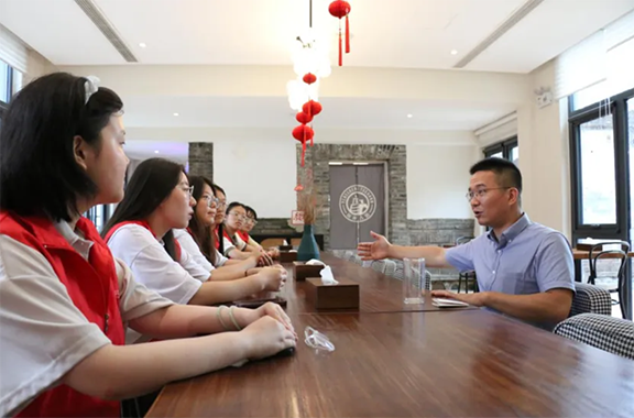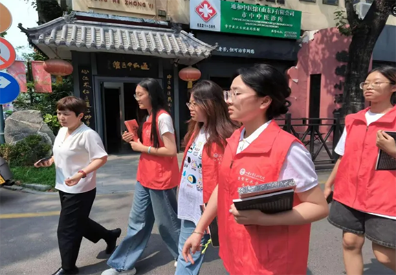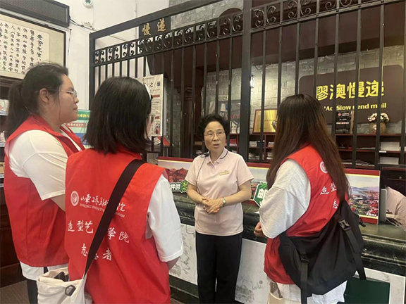 (图为淄博市颜神古镇负责人为团队成员讲述颜神古镇发展历史)