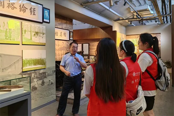 (图为青岛市邮电博物馆馆长为团队成员讲解青岛市邮电产业发展历史)