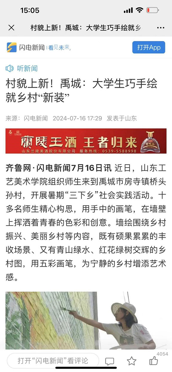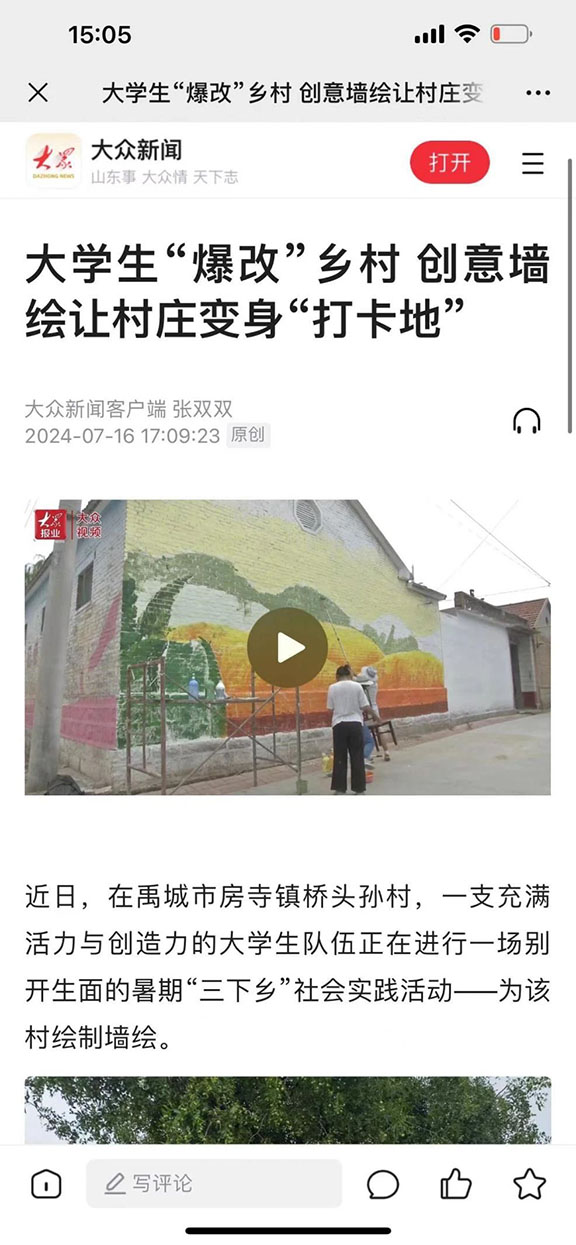 本次社会实践活动,共创作主题墙绘10余幅,近400余平方米,不仅美化了乡村环境、提升了乡村形象,而且传播了中华文化,让群众在耳濡目染中感受中华文化的熏陶,活动受到大众新闻、闪电新闻、德州日报、德州晚报、齐鲁晚报德州融媒、大众网德州等媒体广泛关注、报道。