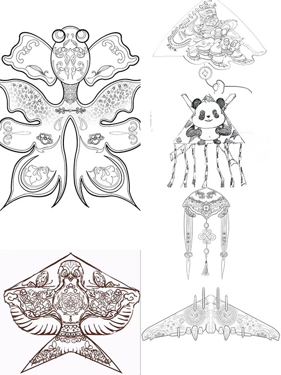 此后老师、学生与合作社建立线上调研合作小组,进行线上设计沟通,指导老师、合作社给团队成员提供调研图片、风筝设计图、相关设计要点,团队成员在指导老师的指导下进行设计创意,完成收集素材、整理资料、调研定位、发散思维,草图创意等内容。