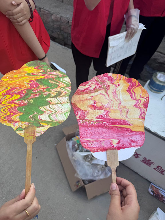 在活动的最后阶段,本实践团队成员们精心举办了一场“漆扇制作”活动,邀请广大村民朋友参与到活动中来亲自体验漆扇制作的魅力,同时本团队将精心制作的漆扇作为礼物赠送给参与活动的老人和小孩,传递着温暖与关怀。