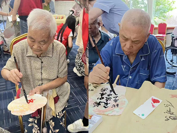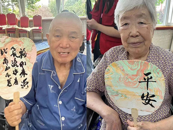 实践活动伊始,团队成员们耐心地向老人们介绍漆扇制作的流程。在同学们的帮助下,老人们纷纷拿起画笔,轻蘸颜料,在扇面上勾勒出心中的美好图案。其中,有老人以鲜艳的五星红旗为题材,深情表达对伟大祖国的无限热爱。通过重绘青春记忆,让那段珍贵的时光在扇面上得以永恒定格,以漆扇为本见证了红色精神与传统文化完美融合。