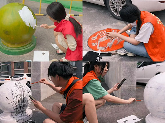 活动伊始,团队成员利用创意绘画的方式巧妙地根据社区基础设施的具体情况进行创作,兼顾构图的合理性、色彩的和谐性和景观的整体性,为一个个不起眼的石墩和井盖穿上了“新衣”。成员们以画笔为媒介,为传统艺术赋予崭新活力,不仅美化了社区面貌,也让更多社区居民了解了国画艺术的魅力,弘扬了中华民族源远流长的优秀传统文化。用绘画艺术传递红色正能量,助力社区文化传播事业,丰富居民精神文化生活。