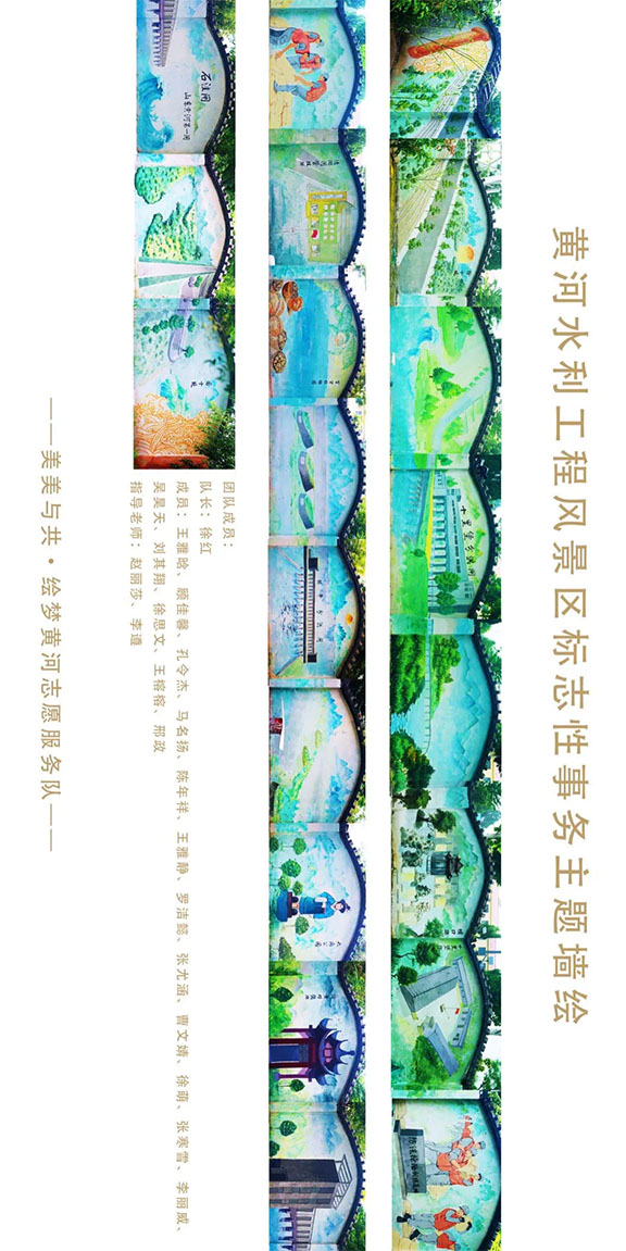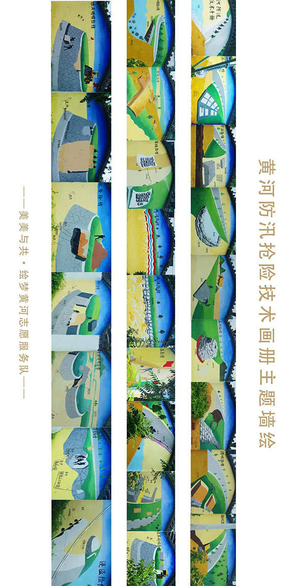 此次创作总面积约300平方米,展现徐十堤、堵口碑、十里堡防汛仓库、防汛抢险训练基地、进湖闸管理所、百亩核桃园、大禹公园、治黄功德碑、国十堤,以及十里堡闸、林辛闸、石洼闸等标志性该段沿黄点位场景的同时,创作以防汛抢险技术图示为创作内容,着重宣传普及防汛抢险技术,以提醒公众增强防汛防洪意识,提升应对风险灾害的应急能力,筑牢安全防线。最后一抹色彩的落定,“美美与共·绘梦黄河”志愿服务队的“绘梦黄河•文化铸魂” 主题文化墙绘创作在东平黄河河务局进湖闸管理所正式宣告收官。在本次实践活动中,团队成员们克服了暴雨侵袭、高温炙烤等重重困难,用汗水与心血共同绘制了一幅幅生动展现黄河文化的壮丽画卷。