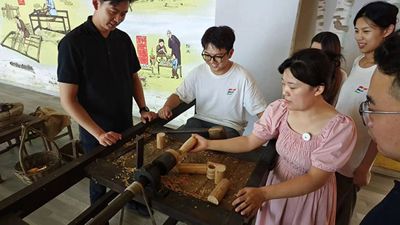 下午,调研团前往校友企业郯城润泽木制品有限公司,调研国家级非物质文化遗产传统美术代表项目传统玩具(郯城木旋玩具)传承发展和创新转化情况,并与校友、公司负责人樊森开展访谈。“临沂市工艺美术大师”“山东省残疾创业之星”“山东省残疾人创业标兵”……这些称号都是80后樊森靠着不服输和敢拼敢闯的劲儿取得的成绩,同时他也是郯城木旋玩具第十九代传承人。木旋玩具的制作需要经过备料、风干、下料、车型等9个过程,樊森从8岁就跟随父亲学习旋木,现在已经驾轻就熟,变成了养家糊口的手艺。“作为年轻人,热爱木旋就想要它永远传承下去,只有满足当代人民生活,才能将其发扬光大”,樊森坚定的说道。确实,文化“两创”的标语在他创办的润泽木旋非遗馆内随处可见。在木旋制作上,他不只拘泥于传统的老款式,而是不断用新观念、新方法、新技术、新工具创造出新的产品来服务当代不同群体,有年轻人喜欢的木旋“香薰”、摆件,也有结合蒙氏教育打造的一系列幼儿启蒙玩具,这些新产品受到追捧、远销海外,正如樊森所说,“不断结合时代需求推陈出新,才是木旋玩具成功的秘诀”。同时,公司在樊森的精心经营下,成功入选“山东手造·优选100”企业,解决帮扶特困残疾人就业23人,带动周边2万多人实现就业,它正以青年榜样的姿态、青春向上的力量吸引更多青年人加入非遗传承、文化“两创”事业之中。