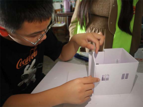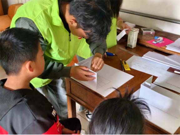 在初步了解建筑学及风景园林专业的基础上,志愿者们巧妙引导孩子们放飞想象,绘制出心中理想的家园蓝图,并依据专业标准,指导孩子们绘制出搭建模型的草图。通过图文并茂的讲解、直观的操作示范,志愿者与孩子们共同投入到理想小屋的模型搭建中,将创意与梦想化为现实。