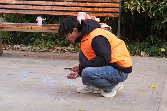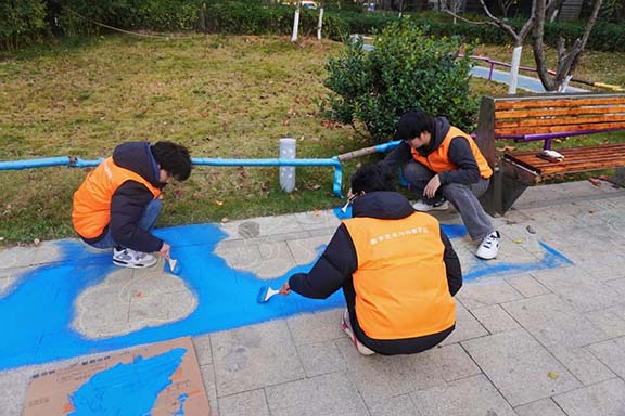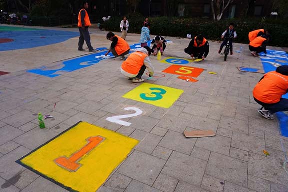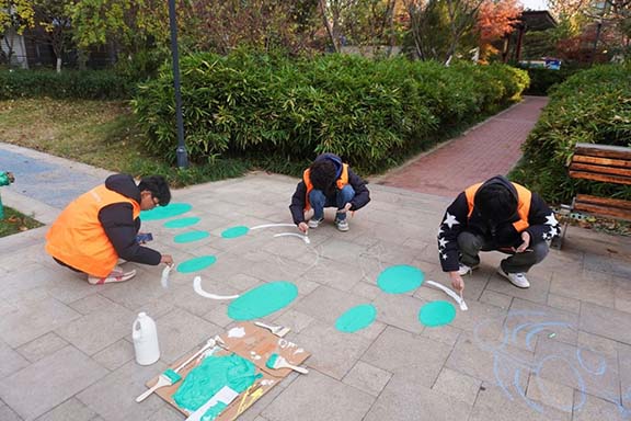 志愿者们分工有序,有的勾勒轮廓,有的调配色彩,有的雕琢细节。地面上,绘有跳房子游戏“地图”,配以小花、蘑菇、七星瓢虫等可爱图案,为孩子们的课余时光增添欢乐。街边小路两侧,蓝白相间的祥云图案寓意吉祥,路中荷花图案尽显泉城特色,让人如置荷香四溢的美景之中。