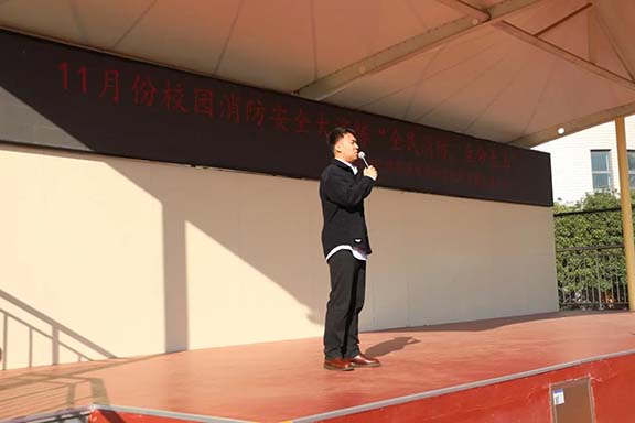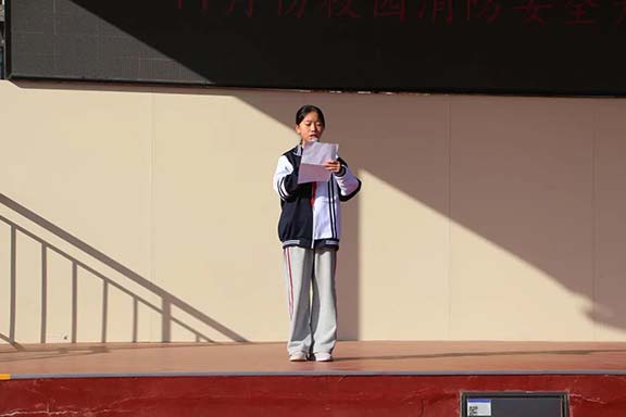 学生代表上台演讲,呼吁大家重视消防安全,提高火灾防范意识和危险应对能力。通过教育和实践相结合的方式,可以有效增强同学们在紧急情况下的自救互救能力,从而保障校园安全。
