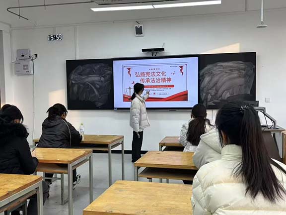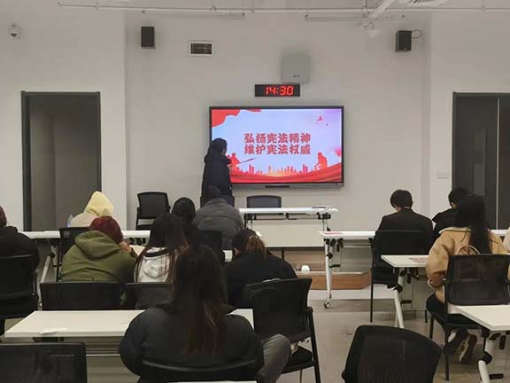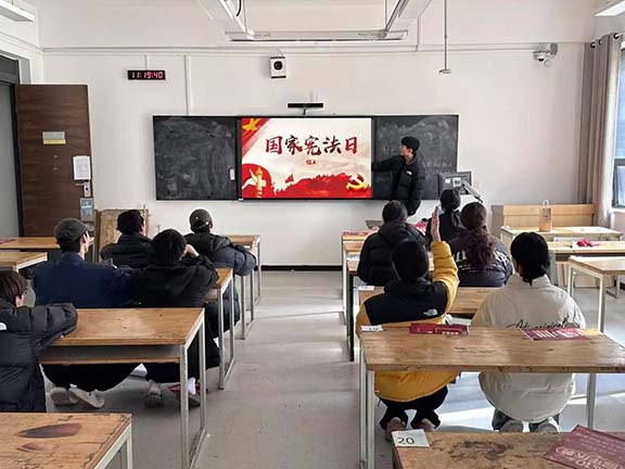 活动期间,各团支书精心准备,以丰富多元的形式带领同学们深入学习法治思想。通过PPT 演示与视频播放相结合的方式,不仅阐释了习近平法治思想的深刻内涵,还系统讲解了宪法、民法典、教育法律法规以及国旗法、国歌法、国徽法、爱国主义教育法等相关法律知识。同学们在学习中进一步明确了新中国宪法的发展脉络、重要地位与作用,深刻领悟了党的十八大以来全面依法治国所取得的历史性突破与伟大成就,切实感受到法治精神的核心要义。