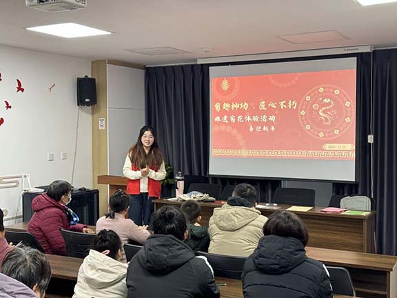志愿者们详细地向大家介绍了非遗窗花的历史渊源与文化内涵,并亲手讲解和演示剪窗花的基本技巧和裁剪要领。