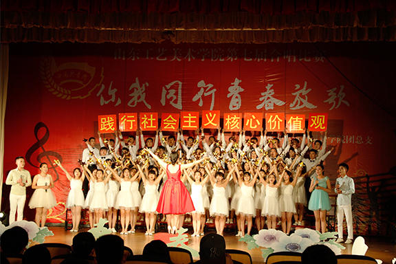 伴随着主持人精彩的开场白,本次大赛拉开帷幕。随后,各个学院参赛选手按顺序依次上台表演。比赛中,各学院表现出色,整个会场中的欢乐歌声和热烈掌声交织成了一首美妙的青春赞歌。数字艺术与传媒学院队伍着装整齐,容光焕发,演唱了《光荣啊,中国共青团》和《我相信》两首曲目。数字艺术与传媒学院参赛选手精湛的演唱技巧与和谐统一的和声配合,将现场气氛带向高潮。合唱中歌声时而激情高亢,时而柔和低沉,跌宕起伏的歌声感染了台下每一位观众,引来一片轰鸣般的掌声。最终数字艺术与传媒学院以三等奖的优异成绩为本次活动画上了圆满的句号。