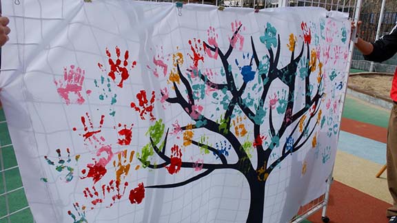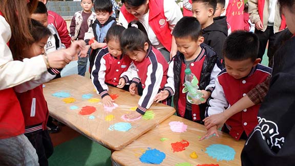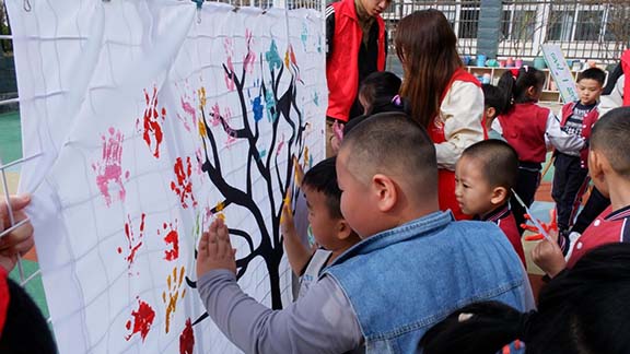 活动现场,志愿者们设计了手掌印画互动环节。孩子们用手掌蘸取颜料,彩色手印变成了大树的枝叶,欢声笑语中齐心协力完成了一棵枝繁叶茂的大树画,在满满的童趣中体会到了保护环境、爱护家园的重要。