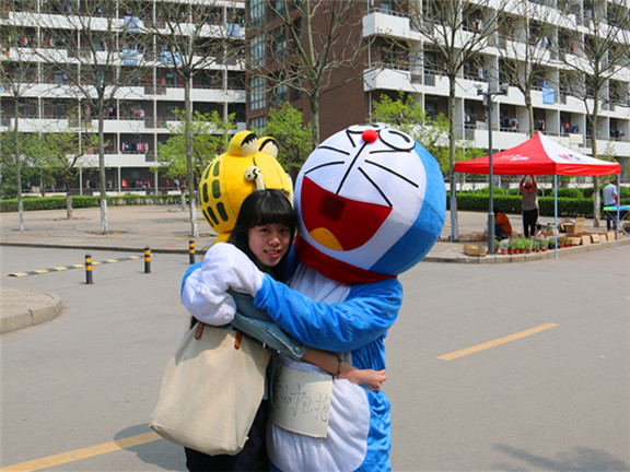 4月17日,在设计师广场举办“爱的抱抱”温暖传递行动。今天你拥抱了么?为了消除人与人之间的猜疑、警惕,拒绝冷漠与隔阂,特举办此活动。活动中,爱心社成员扮演的卡通人物与路过的同学们拥抱并拍下照片作为留念。活动以一种直接和温暖的形式延续爱的寄托,在拥抱的那一刻温暖在心与心之间蔓延。活动意在提醒同学们用热情和努力对这个日渐冰冷的社会和人心说“不”,善待身边的每一个人。现场活动结束后,学院通过团总支微博、同学微博,将爱的能量继续传递。