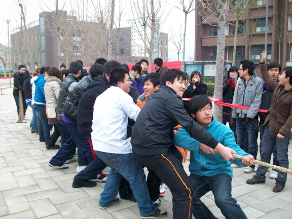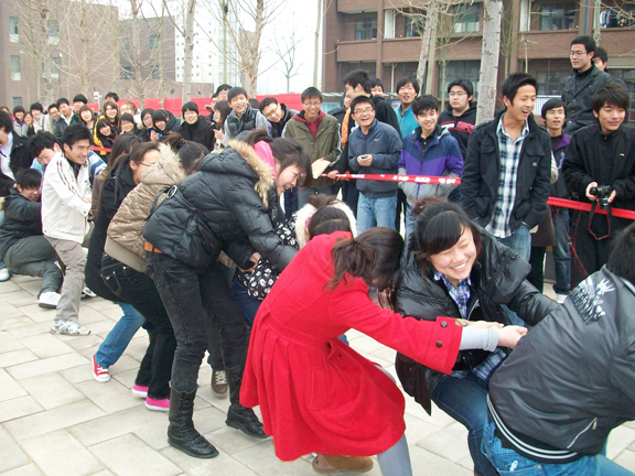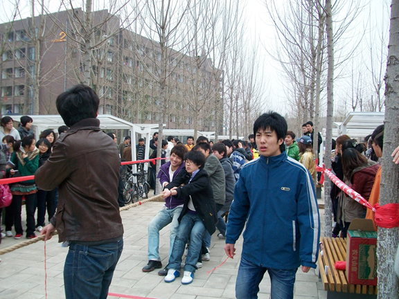 为丰富同学们的课外活动,营造健康向上、团结拼搏的校园氛围,使同学们更加积极主动的融入到大学生活中,3月17日下午5:00,由我校校学生会主办的拔河比赛淘汰赛在长清校区17号公寓楼前举行。本次淘汰赛采用三局两胜制,共有四个学院参加。其中视觉传达设计学院对战人文艺术学院,数字艺术与传媒学院对战现代手工艺术学院。