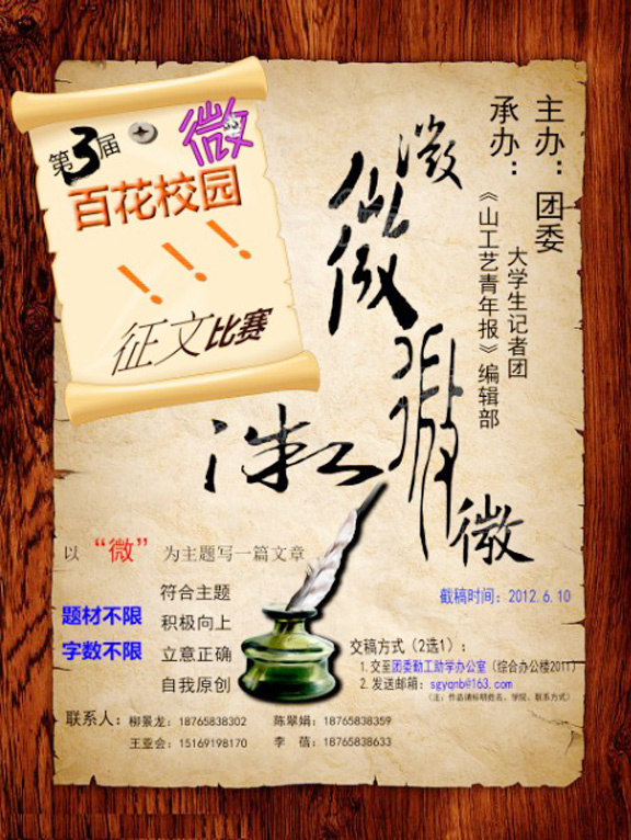 第三届百花校园征文比赛作为大学生科技文化艺术节系列活动之一,本次百花校园征文比赛以“微”为主题,题材不限,自主创新、内容积极向上、思想健康、文笔清新、贴近大学生活。希望《山工艺青年报》能够真正成为学生表达情感、信念与追逐梦想的舞台,编辑部特向广大同学征集优秀稿件,希望广大同学积极参与本次征文活动!