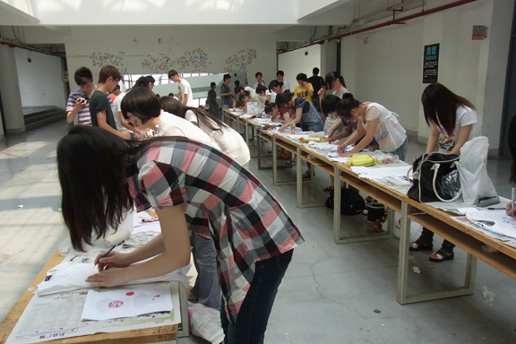 比赛伊始,为了保证本次活动的顺利进行,工作人员提前到场布置场地,进行分工。参赛人员信息登记,T恤发放,信息卡片制作,作品收取等一系列流程分工明确,进行顺利。本次活动由承办方提供空白T恤,参赛选手自备其他材料进行现场的手绘制作。参赛者热情高涨,从起稿到上色一丝不苟,充分发挥了自己的创意思维,创作手法多种多样,制作材料上各有特色。在短短两个半小时里,一件件充满青春活力的手绘T恤从创作者手中完成,工作人员将上交的参赛作品贴上参赛者信息卡并进行整理。