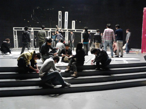 11月14日下午,由团委主办,校学生会承办的第八届“火焰杯”校园十佳歌手大赛前期舞台搭建于在长清校区数字演播大厅进行。
