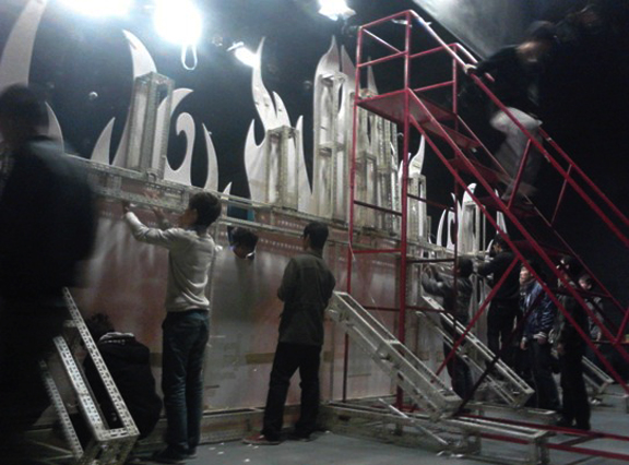 参与本次舞台搭建工作是校学生会各部的部长以及干事们,搭建过程中,大家在筹委会委员以及各部部长的带领下,团结合作,积极投入并顺利完成后期收尾工作。为了能让活动做得更好,大家在主席与部长的带领下不断地进行商讨,使活动舞台的设计效果不断得到改进,最终在全体人员齐心协力将舞台布置好。此次搭建舞台工作紧扣主题,声情并茂,舞台得体到位,紧扣本届“火焰杯”大赛的主题。