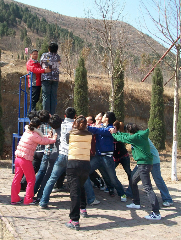 活动开始,大家在教练的指导下分为三组小队进行为期一天的素质拓展活动。分别进行了“攀天梯”、“背摔”、“摆圣塔”及“大求生”四大块训练科目的训练。大家经过紧密的协作与相互的配合,不仅克服了种种艰难障碍,而且最重要的是克服了自身的心里障碍。在活动中,大家超越固定思维、超越自我,为团队的荣誉而努力拼搏,并感悟到了团队配合的真谛。最后,一天的训练在一片欢乐和谐的气氛中结束、