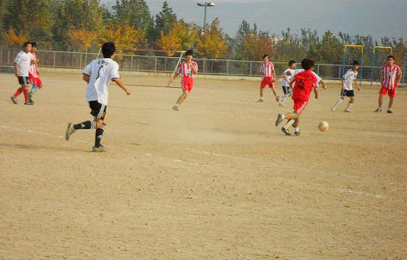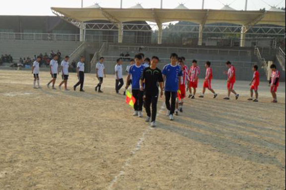比赛伊始,我校足球队就表现出了东道主的霸气,骄阳下的队员个个精神饱满,凭借他们娴熟的球技,开场不久我校队员就破门领先一分。接下来队员们信心倍增,士气高昂,向对方球门屡次轰炸,数次破门得分。下半场开始十几分钟我对球员乘胜出击,比分再次拉大,观众席一次次传出我校同学激动的欢呼声。比赛最后,两队队员体力下降,但双方一直坚持不懈,我校队员更是显示出主场作战的士气,临近比赛终了,比分被锁定为6:0。我校几名参赛队员代伤上阵,依旧坚持到了比赛的最后,我校足球队员赢得的不仅是比分,还是拼搏的精神。