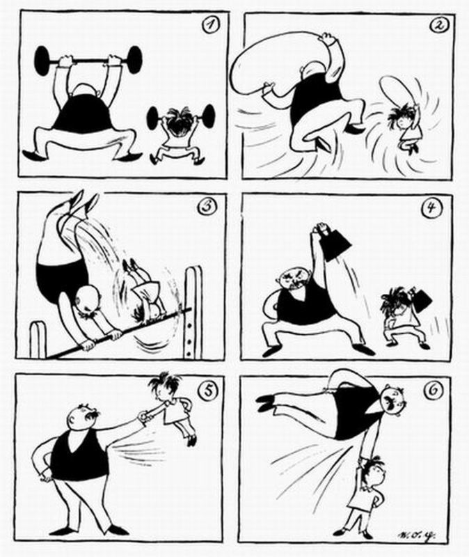 《父与子》反映的是父子之间有趣的故事,那个秃头的大胡子的爸爸,慈祥、和蔼、幽默,那个留着刺猬头的淘气儿子,调皮、聪明、可爱。《父与子》中的漫画尽管没有一个字,却很容易读懂,常使人发出会心的微笑!