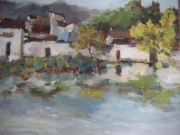 本作品着重表现当时她对眼前景色的一种感受感受,十月清晨的小镇静谧,祥和,一切的事物都很和谐的存在着,很容易让人融进其中,我们的心也可以从城市的喧嚷繁杂回归到小镇的自然朴实之中,当时的情景,让她的心灵受到些许的触动,为留住这原生态的美好画面,所以就用这种方式记录下来了。