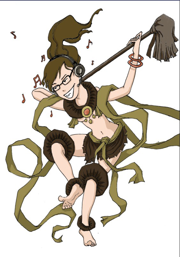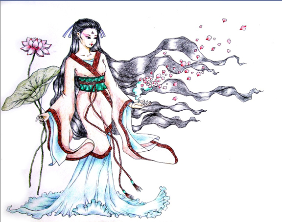 顾:《中国风123》是参考的国粹艺术,京剧人物的造型和华丽的饰物在视觉上给人强烈的美感,我想用漫画这种很时尚的表现形式来展示京剧人物的美感,让更多的人去喜爱这一文化。《与书共舞》的初衷和第一张一样,也是想用漫画的形式展示中国的传统之美,这幅作品借鉴了汉服的造型,但更多的还是自己想象出来的元素,这样画起来更得心应手。《中国风2》参考了敦煌莫高窟的飞天造型,但并没有原汁原味的去展示飞天艺术,只是借鉴了一点皮毛创作了一幅有趣味的插画,飞天有反弹琵琶,我设计成了反弹拖把,并不是对传统艺术的亵渎,只是为了表达一种趣味。中国传统文化博大精神,值得去借鉴的东西数不胜数,这给我的创作提供了任何一种可能性。