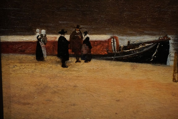 弗米尔的画作并没有留在代尔夫特。他的很多著名的作品如《代尔夫特风景》(图2-2.)、《带珍珠耳环的少女》和《小街》等藏在海牙的莫里茨皇家博物馆和阿姆斯特丹的荷兰国立博物馆。《代尔夫特风景》中河岸上的人物,是用色块叠加而成的,仿佛神来之笔,精彩异常。不到现场近距离观察,体会不到其中的奥妙。弗米尔对色彩的运用,显然已经挥洒自如。而且,这是两百年后,印象主义画家经常采用的方法。托雷重新发现了弗米尔,分析了荷兰绘画的主题,同时也为法国艺术中的自然主义和印象主义在他们的艺术中再现日常生活主题奠定了基础。托雷激发了人们对荷兰绘画的兴趣,荷兰绘画可能对他(托雷)生活的那个时代的艺术产生了很大影响。库尔贝仔细地模仿了17世纪荷兰绘画中的场景,以此来描绘19世纪中叶法国的日常生活。甚至德加也承认他正是在对17世纪荷兰绘画的研究中形成了自己的绘画风格。弗米尔等17世纪的画家对法国印象主义和现实主义产生了如此重要的影响。