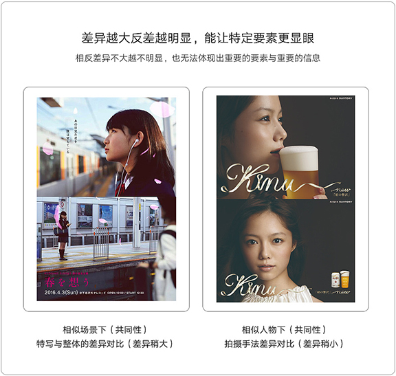 反差指的是多个要素之间的差异。通常设计师在给客户提供设计稿时,会被客户怼着说:这两稿有什么差别么。其实客户认知中的这个“差别”就是反差的意思。差异越大反差越明显,能让特定要素更显眼,相反差异不大越不明显,也无法体现出重要的要素与重要的信息,就不会给读者一种强烈的印象。