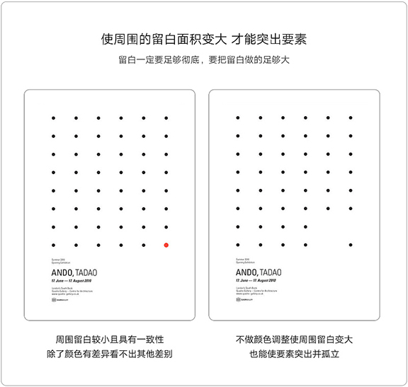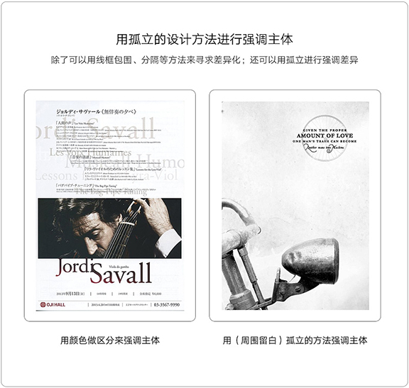 这种方法在版面内有充足空间的情况下很有效果。由于周围的留白意味着与其他要素的内容不同,因此留白一定要足够彻底,要把留白做的足够大。