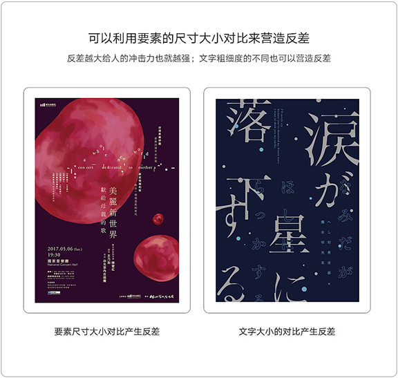 也可以利用要素的尺寸大小对比来营造反差。在设计文字时,即便是同样的字形,笔画粗的字感觉更硬,笔画细的字感觉更柔,两者搭配使用就能营造出反差。上面中“字形”是专业术语,我打算把网格讲完就讲一下字体这块(中/日/英字体结构与差别)。
